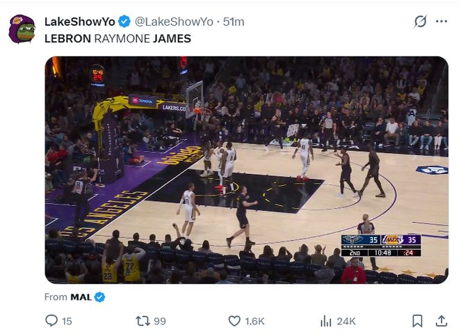 第三节湖人是各种低级失误,詹姆斯3个失误,东契奇5个失误,里夫斯1个失误,湖人全队单节出现了10次失误,这让鹈鹕很快完成反超,虽然詹姆斯登场一度扳平,但小乔丹布朗还是反超2分进入末节,三节打完詹姆斯18分6篮板4助攻5失误。